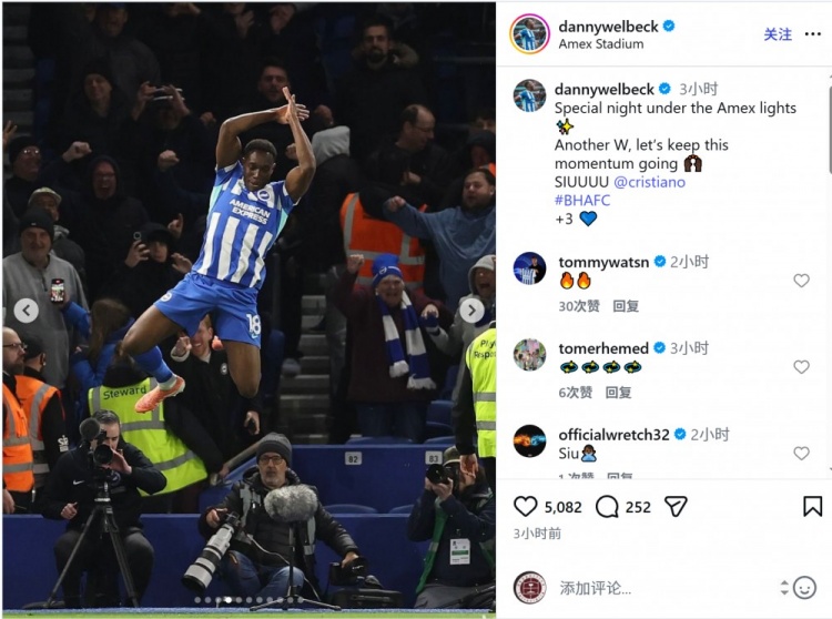 此役维尔贝克补时阶段破门,并做出了C罗标志性的SIU庆祝动作,赛后他在社交媒体上写道:“在运通球场的特别之夜,又一场胜利,让我们继续保持这股势头!SIUUUU@C罗。”